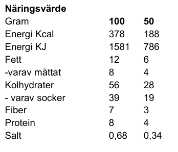 kokosflingor*, kakaosmör*, kanel (0,6%)*, salt.